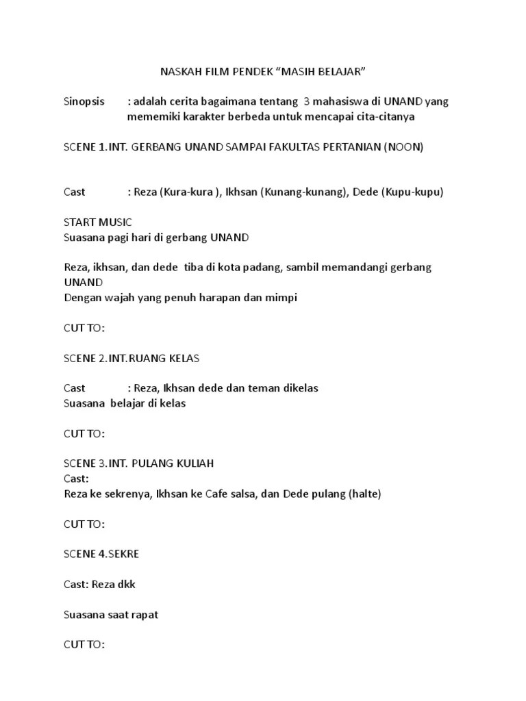 Contoh naskah film pendek motivasi, dokumenter, sekolah, pendidikan, persahabatan, komedi. Kata drama berasal dari bahasa yunani 'draomai' yang berarti beraksi, bertindak, berbuat, dan berlaku. Yang pertama adalah sebuah contoh teks drama dan yang kedua adalah isi koleksi drama pendek singkat sebagai referensi lanjutan untuk belajar . Ada banyak sekali cara mempelajari bahasa inggris yang jauh dari kata sulit atau membosankan. Durasi 5, 10, 15, 30 menit dan script skenario sinopsis penulisan .